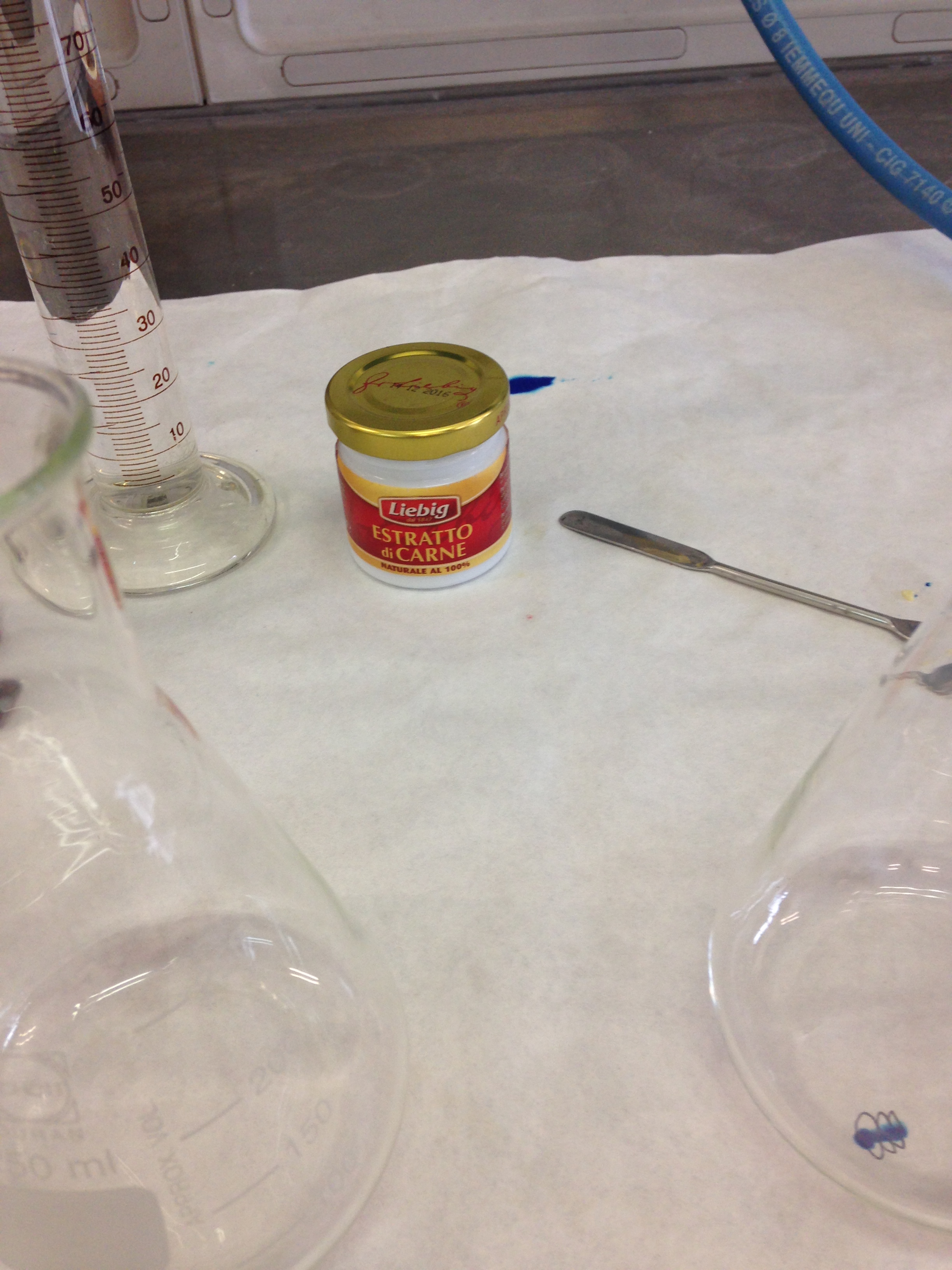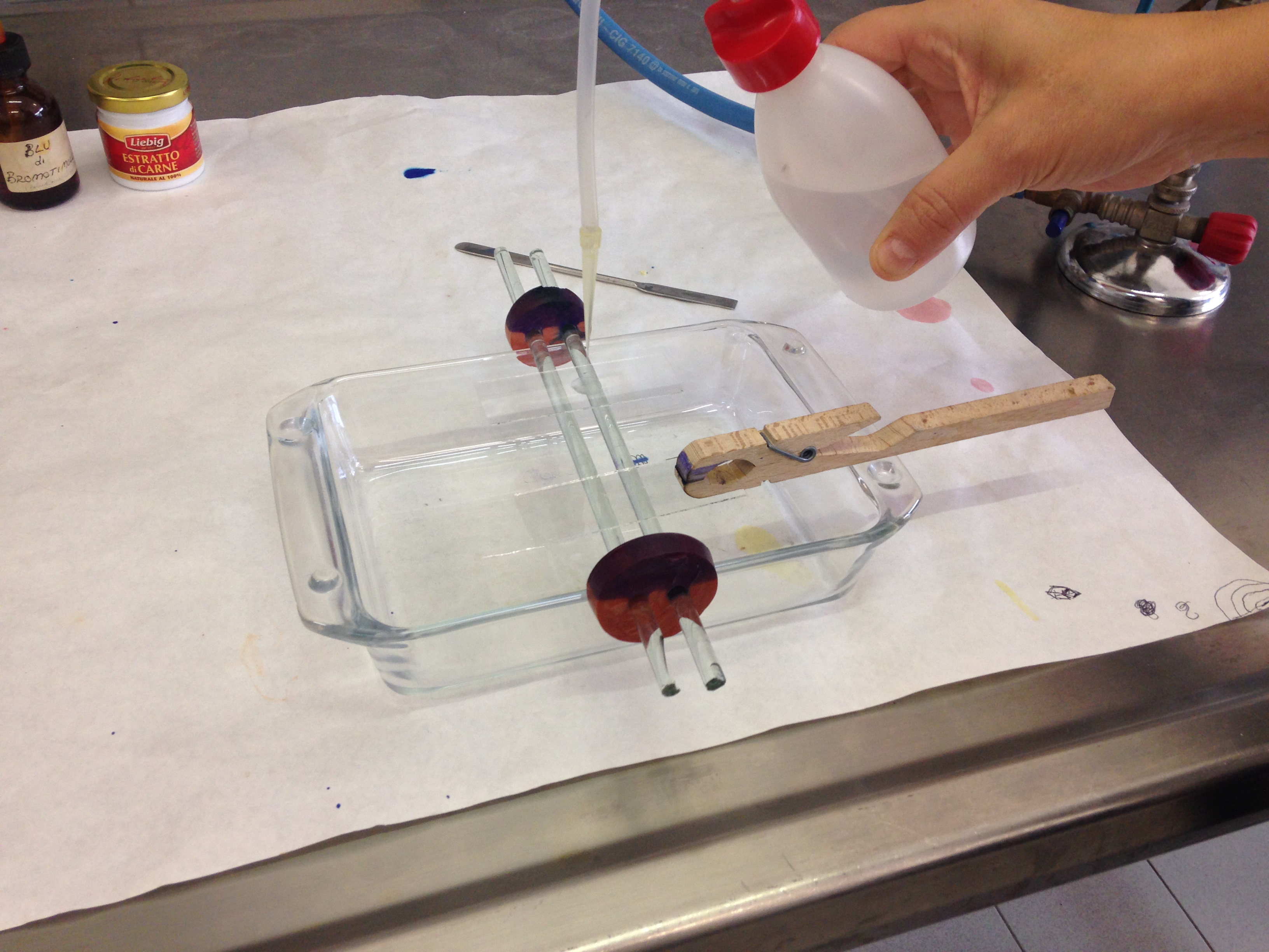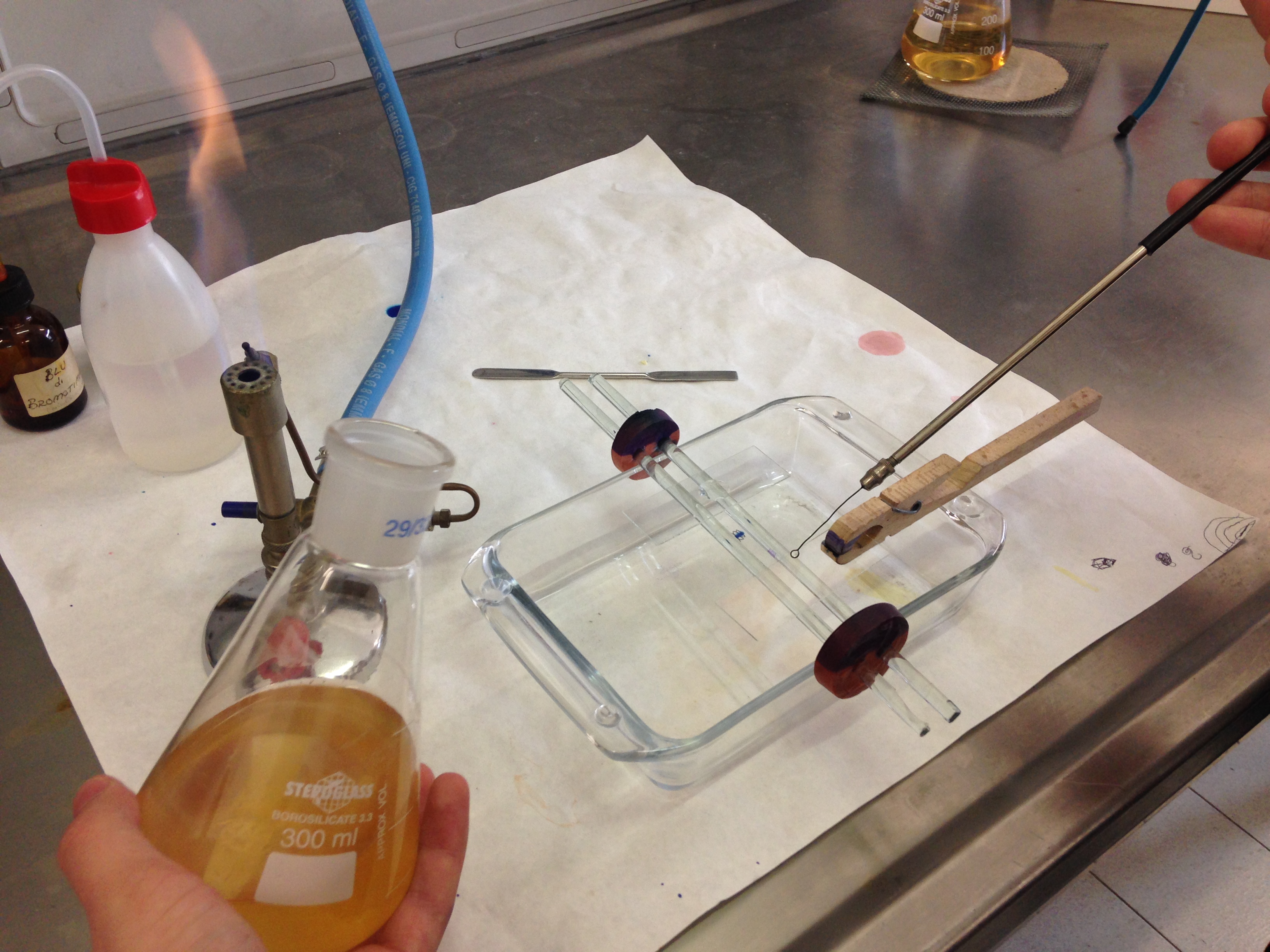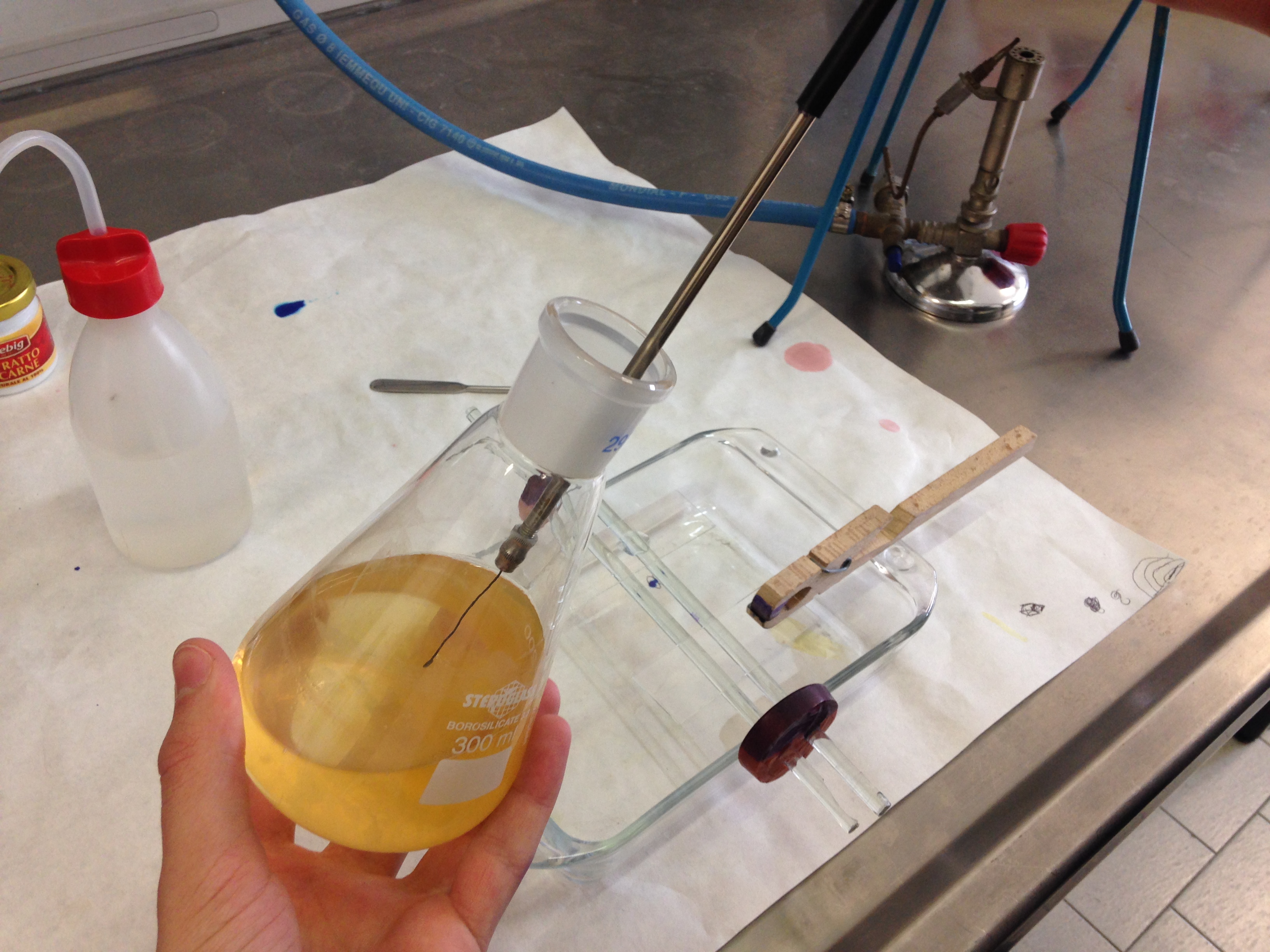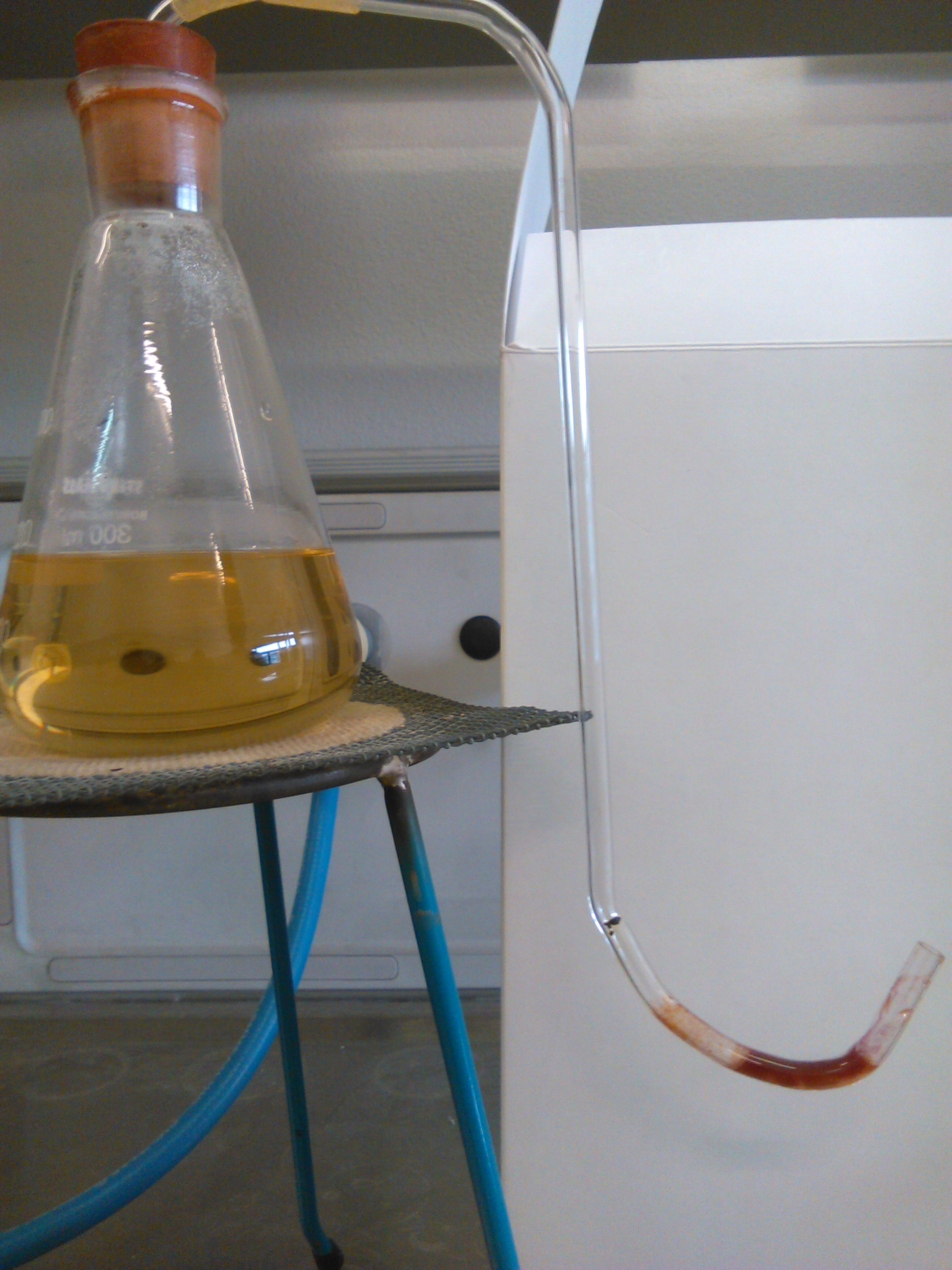 - Porre una goccia di indicatore nel punto ricurvo all'interno del supporto applicato alla beuta per far passare l'aria ( il viraggio di colore da giallo/marrone a rosso/violetto indica una acidificazione del mezzo che si realizza a seguito di una deposizione nell'ansa di muffe o batteri che rimangono intrappolati nella parte bassa dell'ansa mentre l'aria supera la curva e sale fino a raggiungere la soluzione nella beuta).