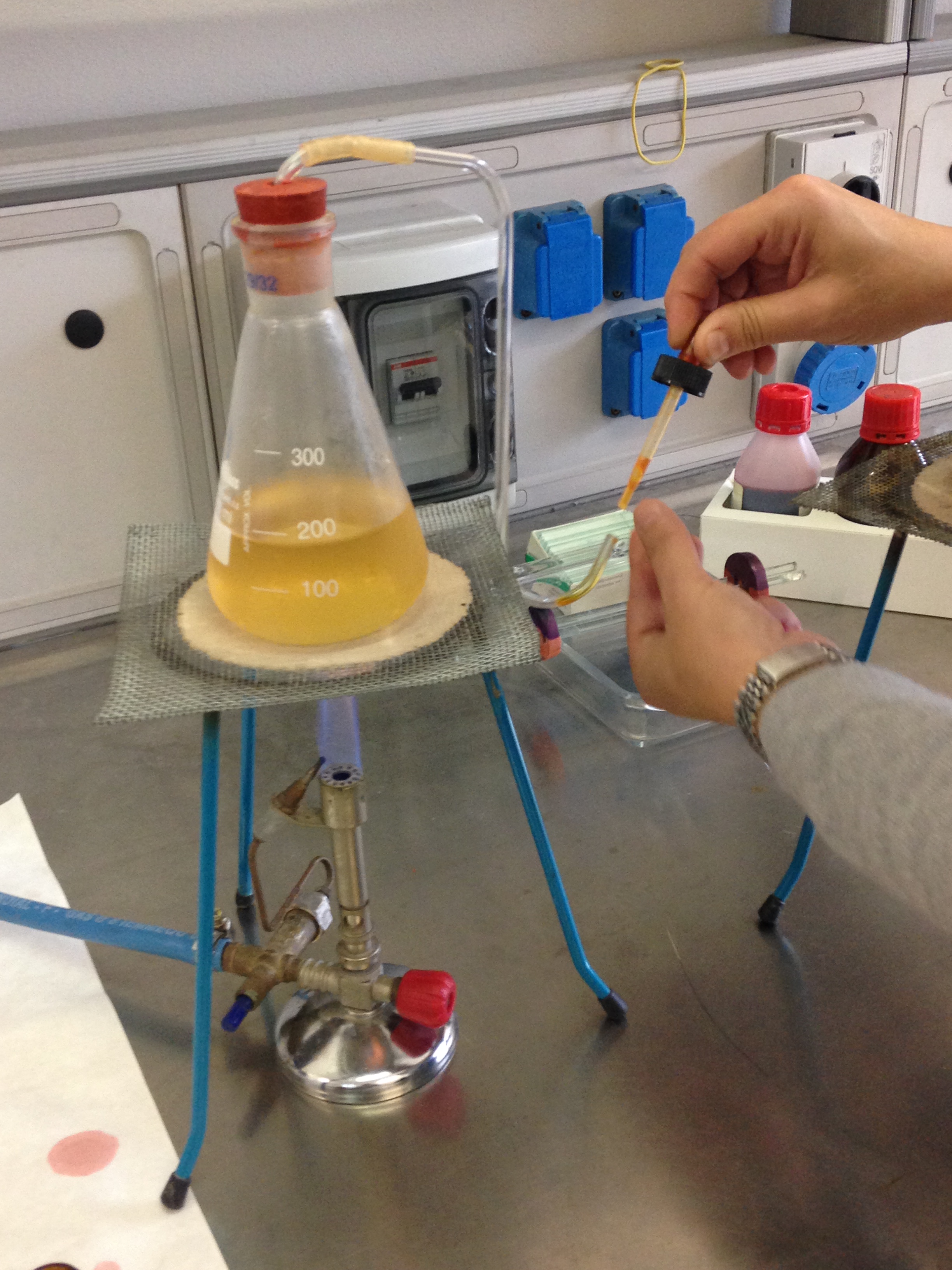 - Porre una goccia di indicatore nel punto ricurvo all'interno del supporto applicato alla beuta per far passare l'aria ( il viraggio di colore da giallo/marrone a rosso/violetto indica una acidificazione del mezzo che si realizza a seguito della deposizione nell'ansa di muffe o batteri che rimangono intrappolati nella parte bassa dell'ansa mentre l'aria supera la curva e sale fino a raggiungere la soluzione nella beuta).