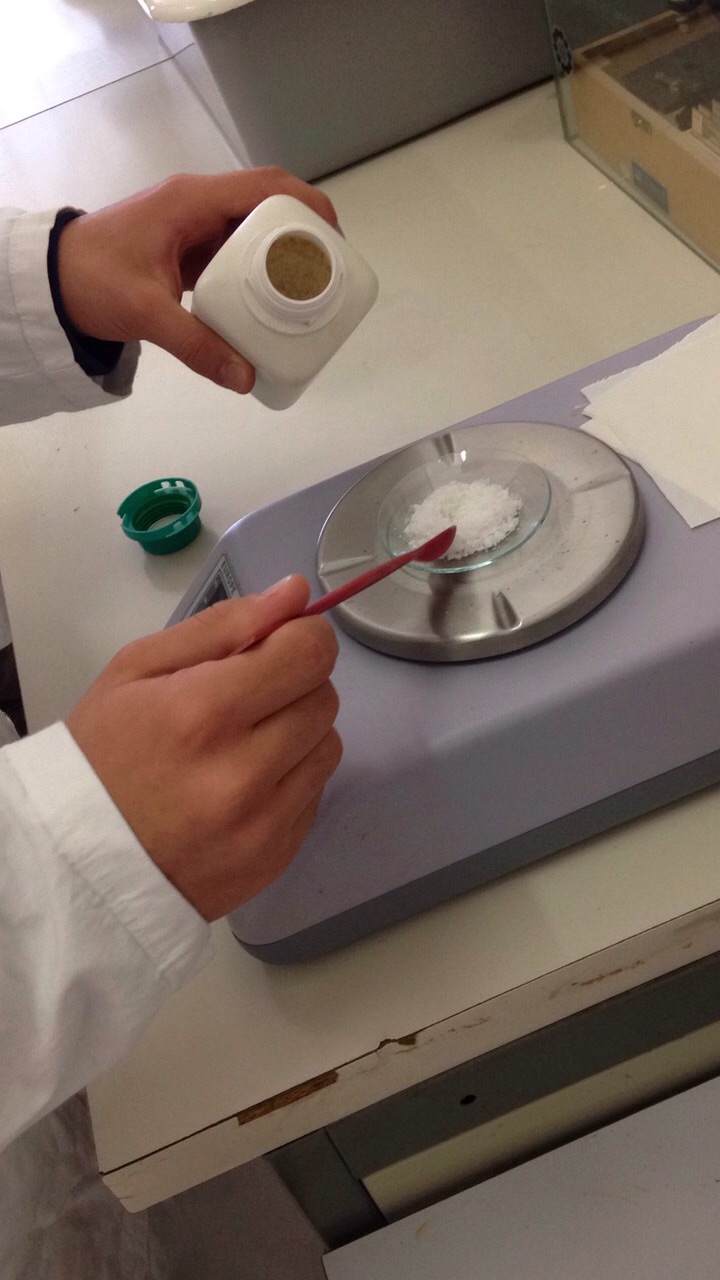 - aggiungere 4 g di $NaOH$, agitare lentamente fino a completa dissoluzione;