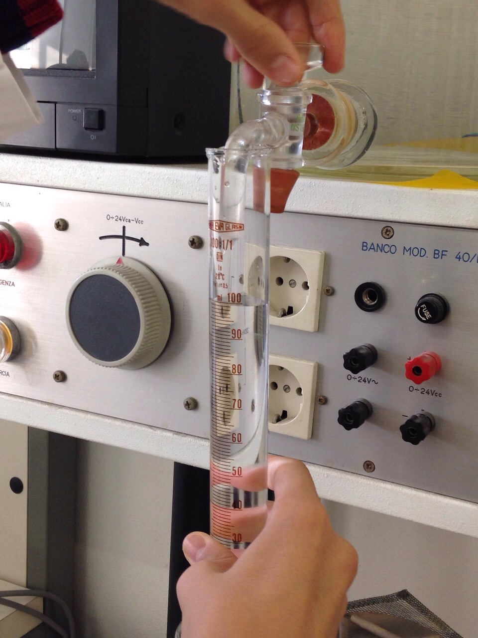 - versare nel becher 100 ml di $H_2O$ distillata misurati con il cilindro graduato;